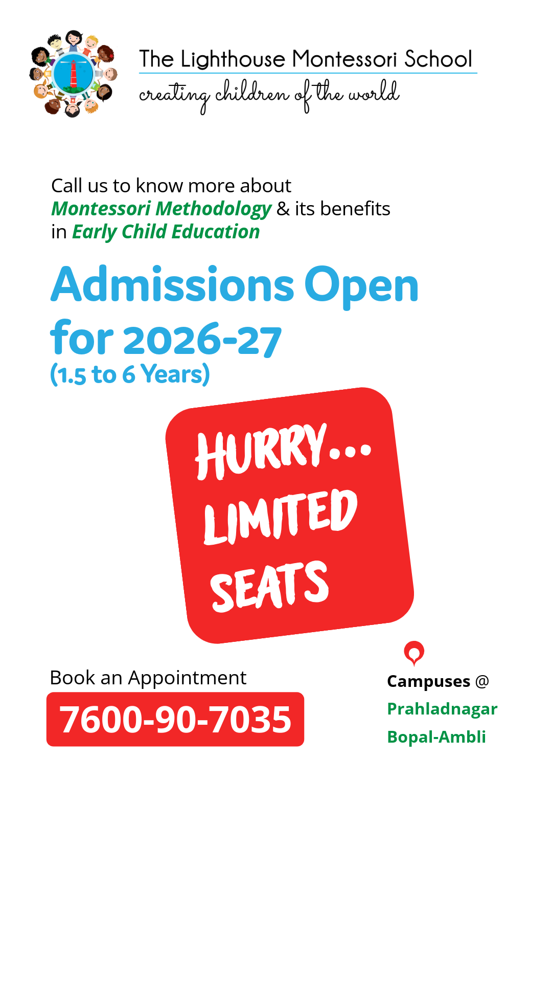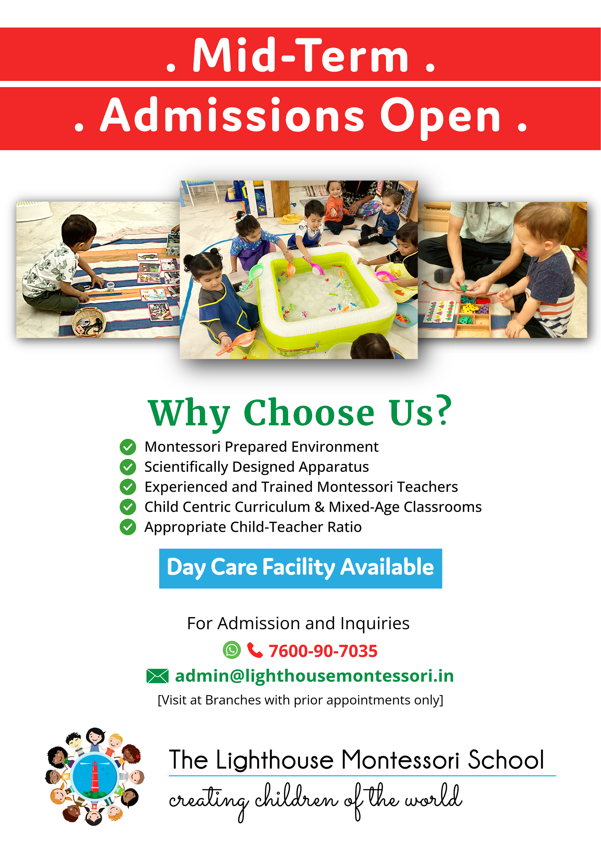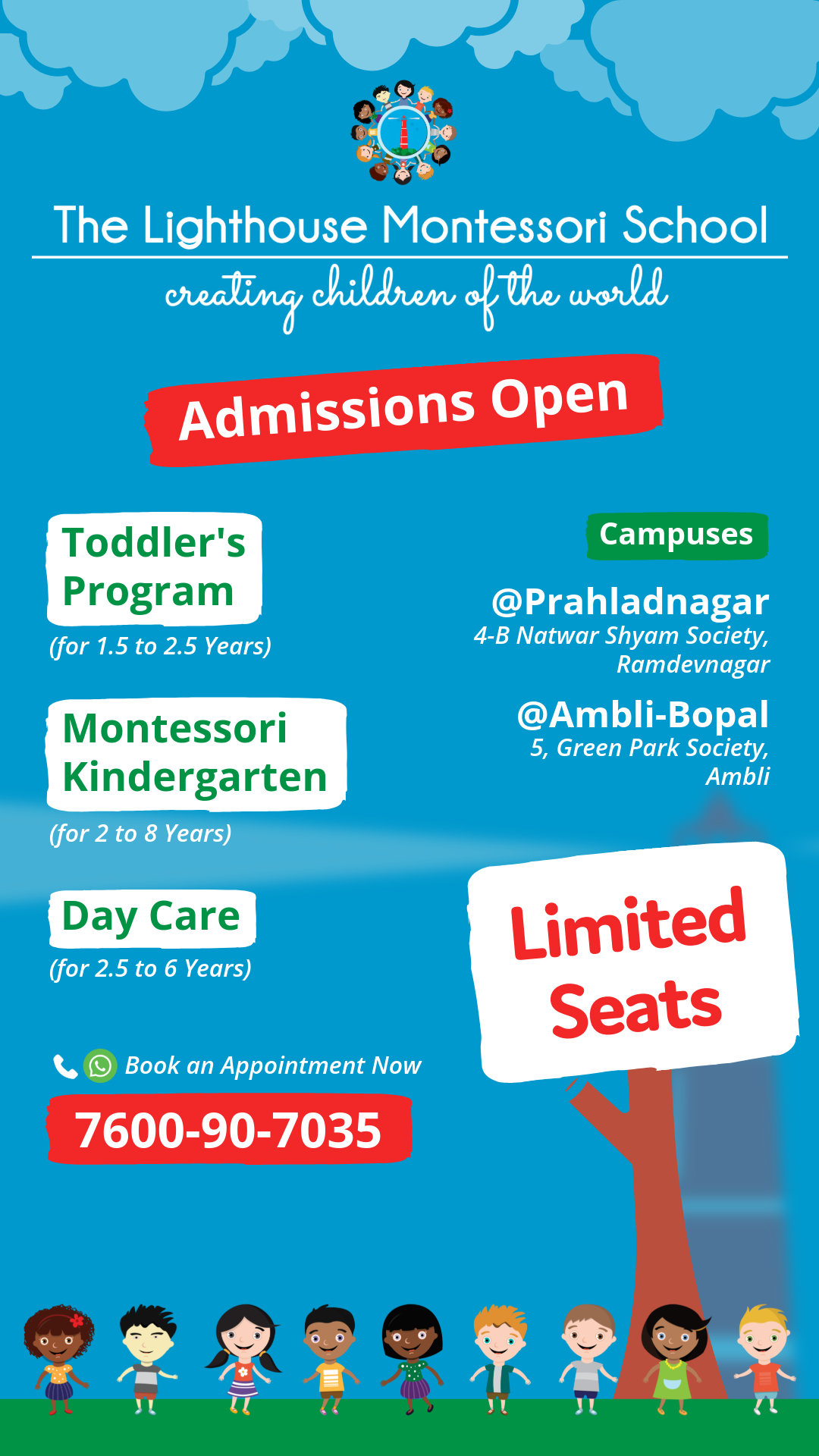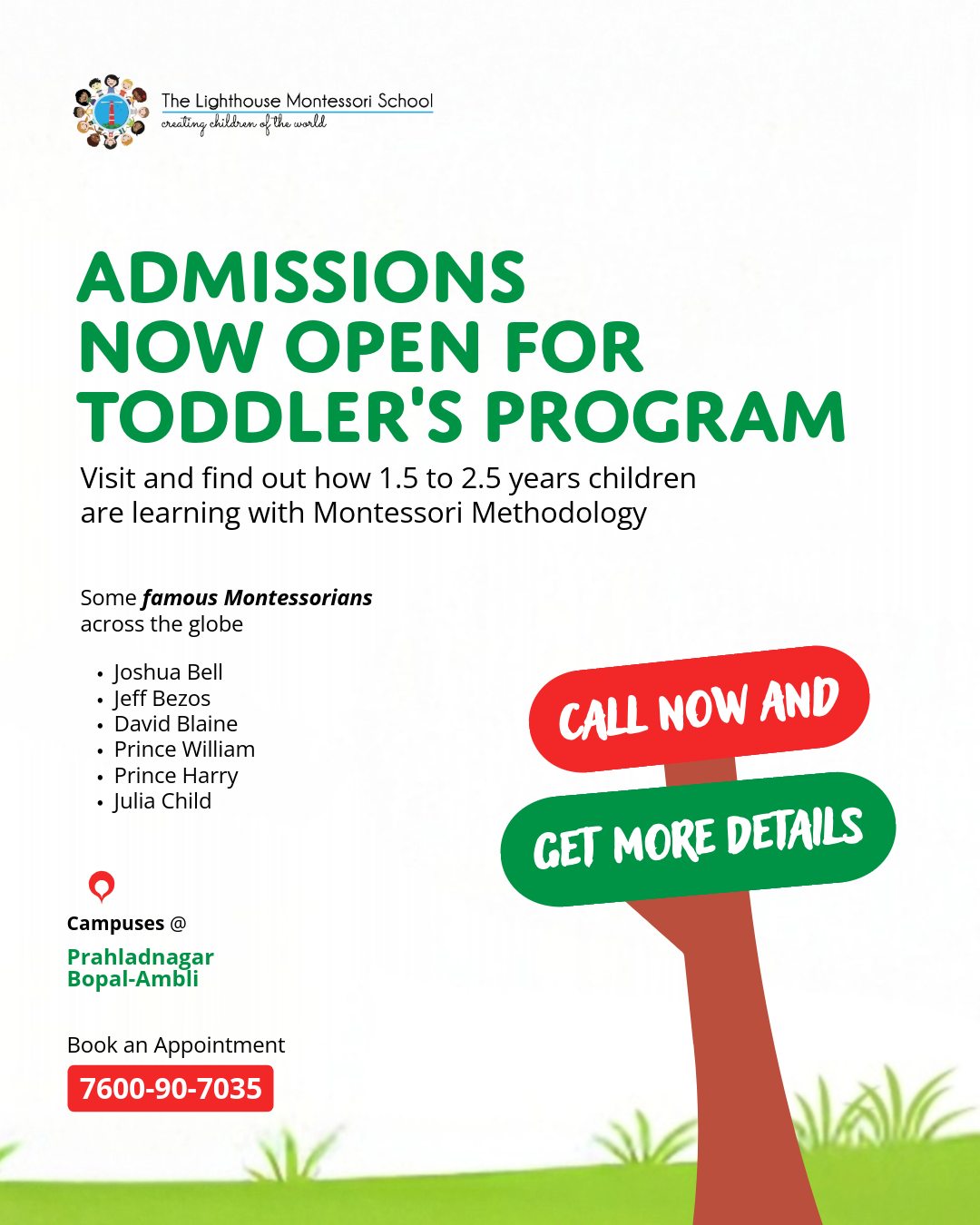 The Lighthouse Montessori School (TLMS) is a noble attempt to promote authentic Montessori principles and schooling in the city of Ahmedabad. TLMS’s first school was set up in 2020 with complete Montessori Apparatus and a beautiful & peaceful environment for children of age groups 2.5 years to 6 years. TLMS envision a safe environment, where children enhance their physical, cognitive, emotional and social skills that helps nurturing them in these formative years to become future civilized citizen of the world who will further contribute towards a peaceful and progressive society.