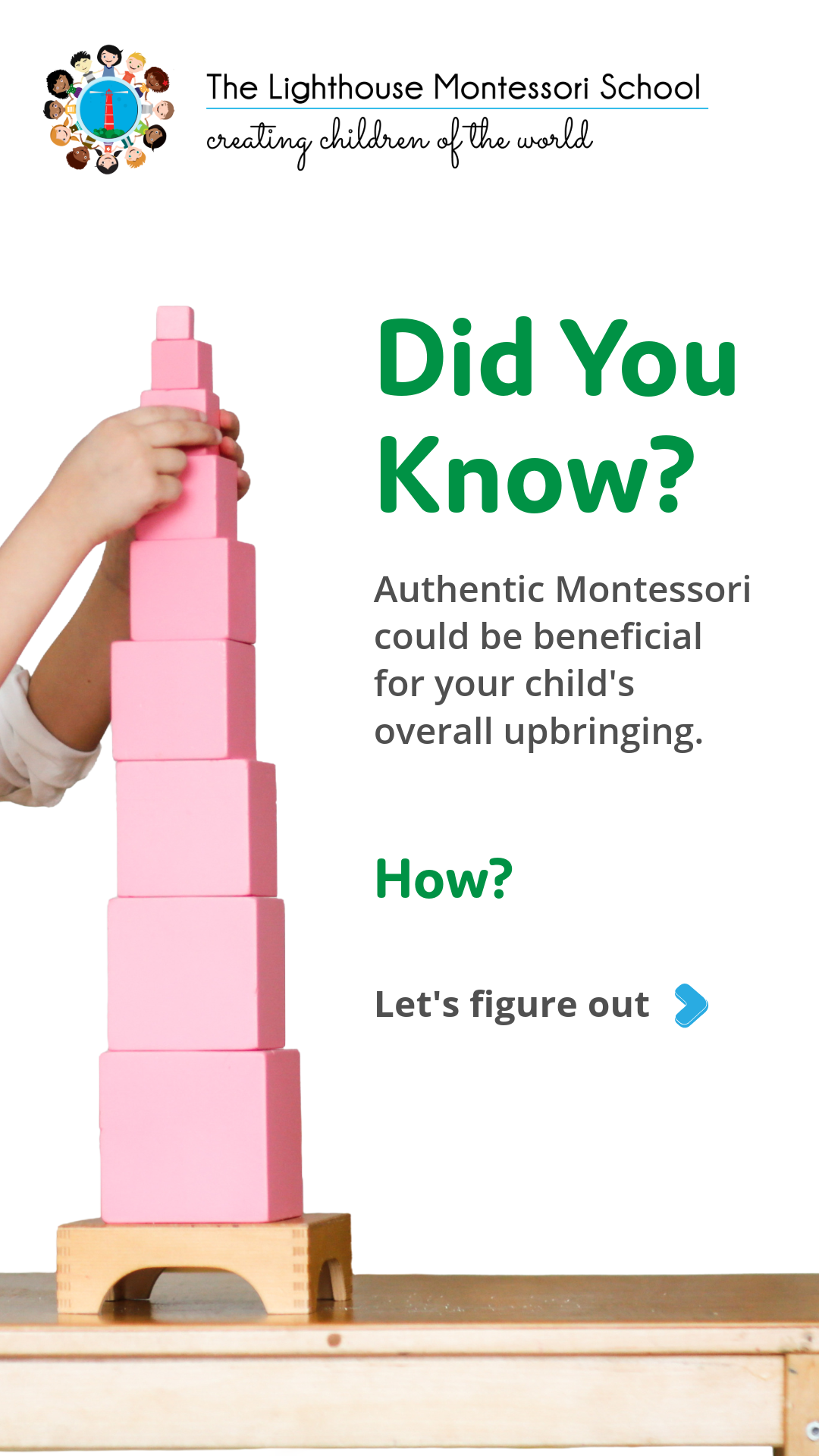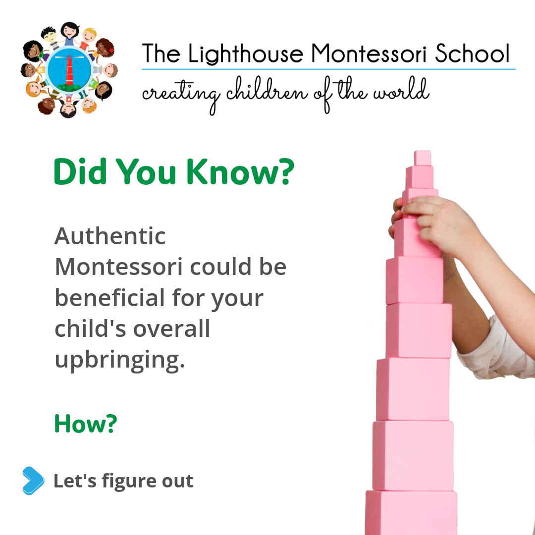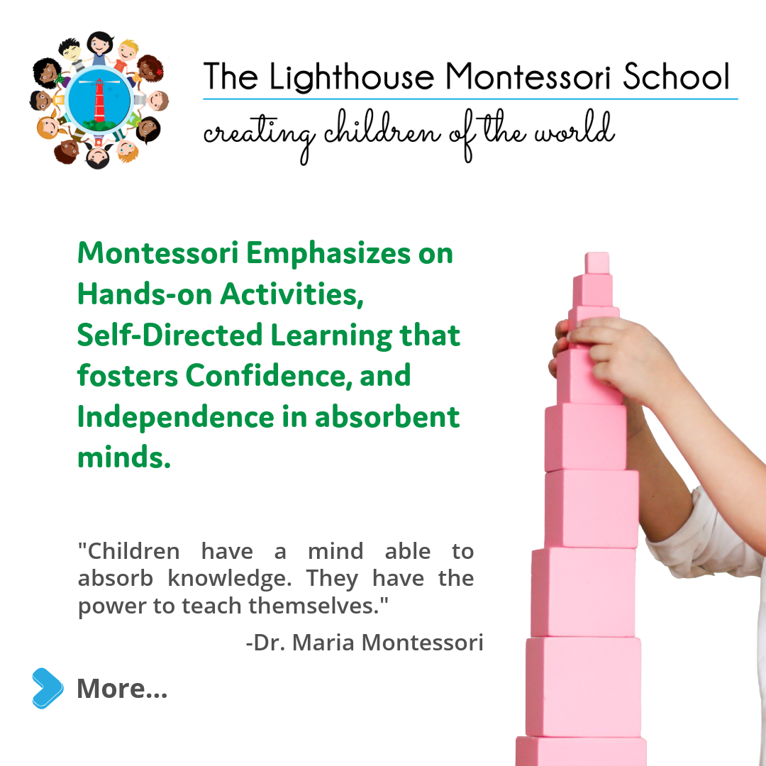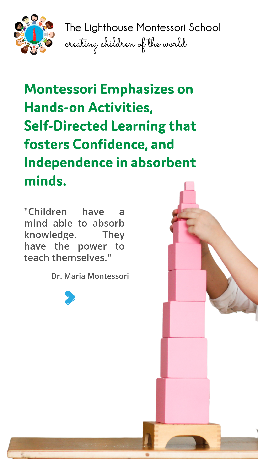 The Lighthouse Montessori School (TLMS) is a noble attempt to promote authentic Montessori principles and schooling in the city of Ahmedabad. TLMS’s first school was set up in 2020 with complete Montessori Apparatus and a beautiful & peaceful environment for children of age groups 2.5 years to 6 years. TLMS envision a safe environment, where children enhance their physical, cognitive, emotional and social skills that helps nurturing them in these formative years to become future civilized citizen of the world who will further contribute towards a peaceful and progressive society.