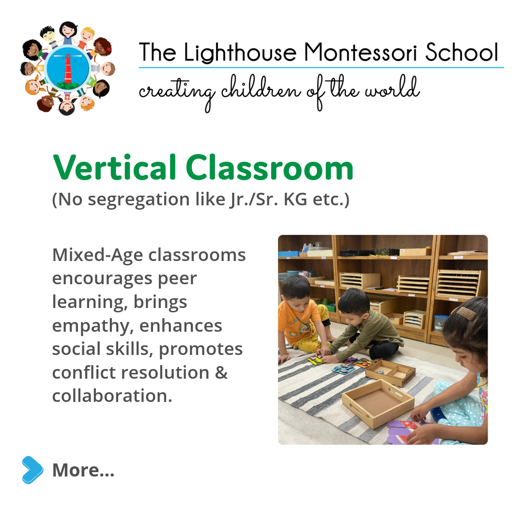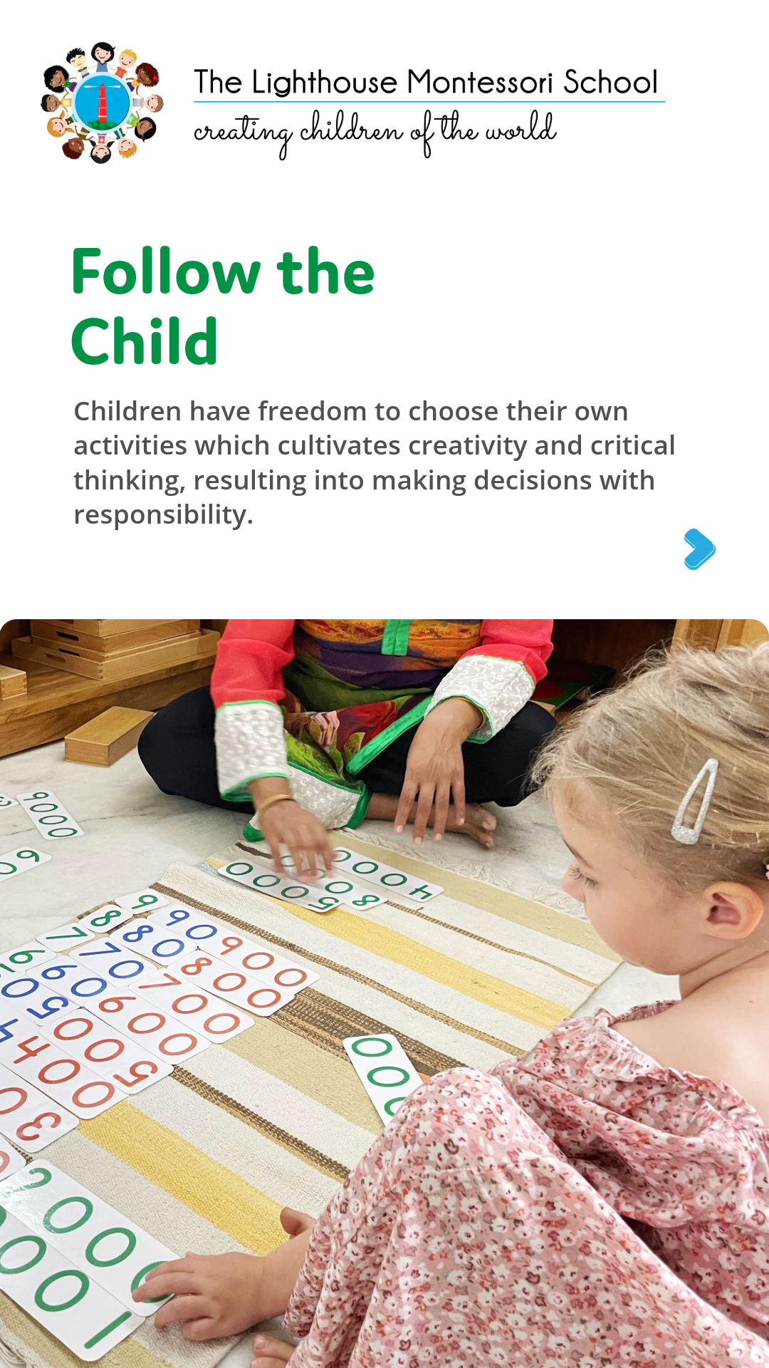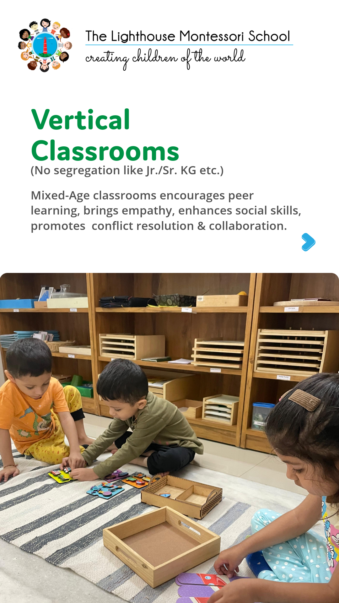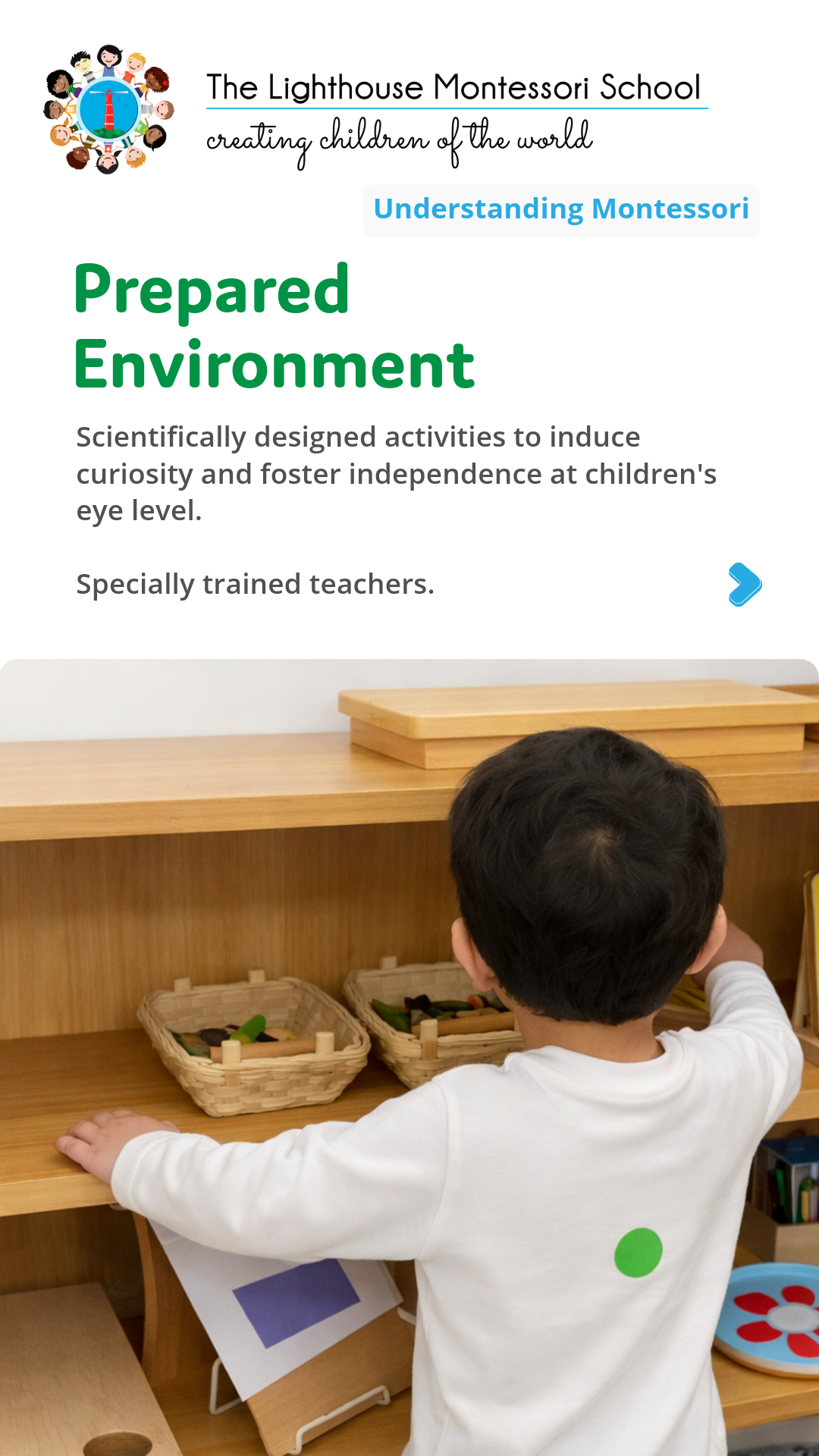 The Lighthouse Montessori School (TLMS) is a noble attempt to promote authentic Montessori principles and schooling in the city of Ahmedabad. TLMS’s first school was set up in 2020 with complete Montessori Apparatus and a beautiful & peaceful environment for children of age groups 2.5 years to 6 years. TLMS envision a safe environment, where children enhance their physical, cognitive, emotional and social skills that helps nurturing them in these formative years to become future civilized citizen of the world who will further contribute towards a peaceful and progressive society.